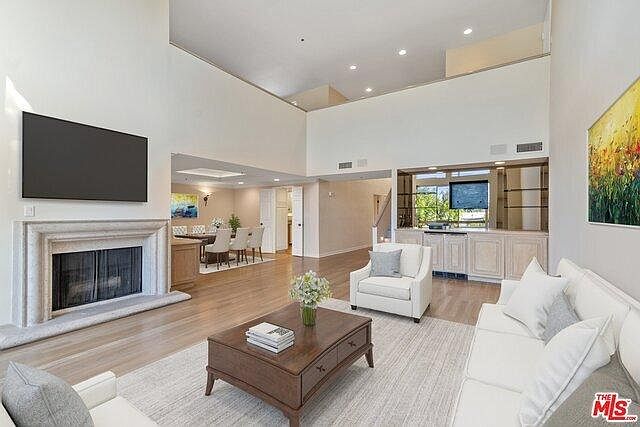 Rarely available is this elegant and stately 3 bed, 2.5 bath corner penthouse in a prime Brentwood location. This unit is flooded with natural light thanks to the huge windows showcasing the main living spaces which include a dramatic 2-story living room with a wet bar & fireplace, a formal dining room, a 2-story den/library, and a large versatile loft space with custom cabinetry. Enjoy cooking in a well-appointed eat-in kitchen with granite counters and top of the line stainless steel appliances or take a break from it all in the enormous master suite with a large walk-in closet and ensuite marble bathroom. Additional features include in-unit washer/dryer, central air/heat, alarm, hardwood floors, recessed lighting, and 2 side by side secured parking spots. Building amenities include a daytime concierge, pool, spa, sauna, gym, rec. room, conference room, and 12 guest parking spaces. Ideally located within close proximity to some of the best parks, dining, and shopping Brentwood has to offer.