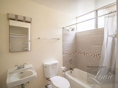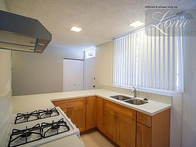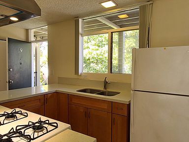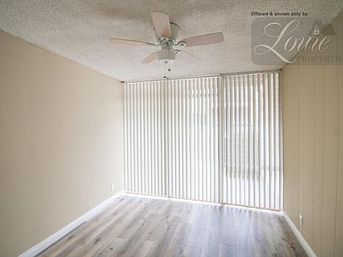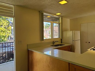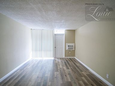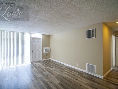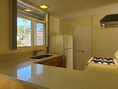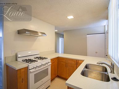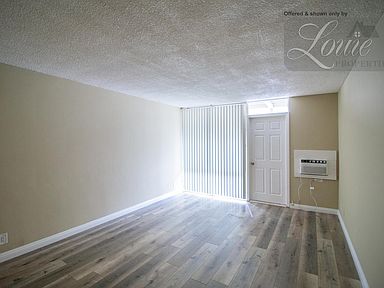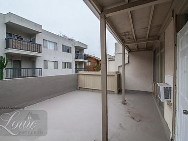 Recently remodeled upstairs unit with large private patio. Laminated flooring and vertical blinds in living room and bedroom. Kitchen was remodeled last year with stone counter tops, new gas stove, new cabinets, stainless steel sink and faucet. Refrigerator included. Window A/C in living room and ceiling fan in bedroom.