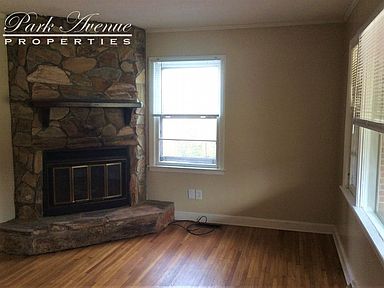 The living room is accented with hardwood flooring and stone masonry fireplace. The kitchen includes black appliances and opens into an additional bedroom with wood-wall paneling. The bathroom is embellished with a tile pattern.